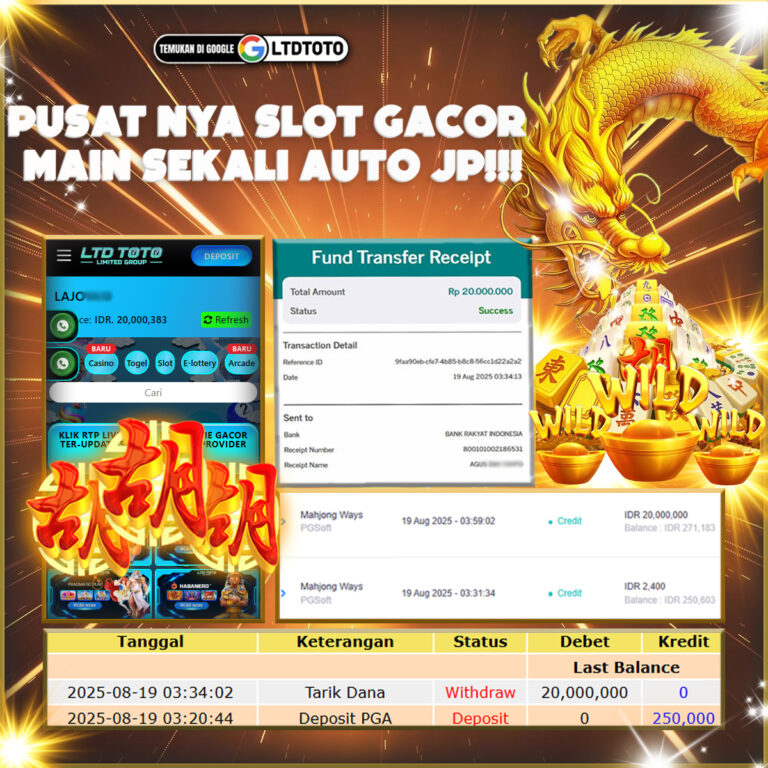 LTDTOTO JACKPOT MAHJONG WAYS 1 RP 20.000.000 SELASA 19 AUGUST 2025 Selamat kepada User id : LAJO**1* Telah berhasil mendapatkan kemenangan besar pada permainan PG MAHJONG WAYS 1 , kemenangan Sebesar Rp. 20.000.000, Setelah mengisi formulir withdraw dengan kurang waktu hanya 5 – 10 menit pihak LTDTOTO sudah melakukan transfer kepada pemilik User id dan dana sudah dapat di cairkan oleh pemenang….