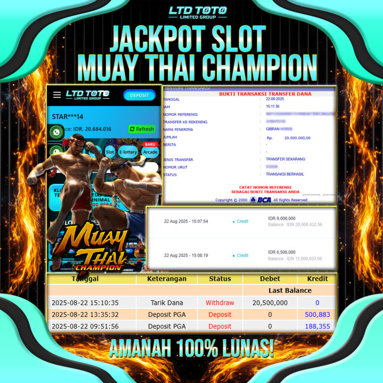LTDTOTO JACKPOT MUAY THAI CHAMPION RP 20.500.000 JUMAT 22 AUGUST 2025 Selamat kepada User id : STAR***14 Telah berhasil mendapatkan kemenangan besar pada permainan MUAY THAI CHAMPION, kemenangan Sebesar Rp.20.500.000, Setelah mengisi formulir withdraw dengan kurang waktu hanya 5 – 10 menit pihak LTDTOTO sudah melakukan transfer kepada pemilik User id dan dana sudah dapat di cairkan…