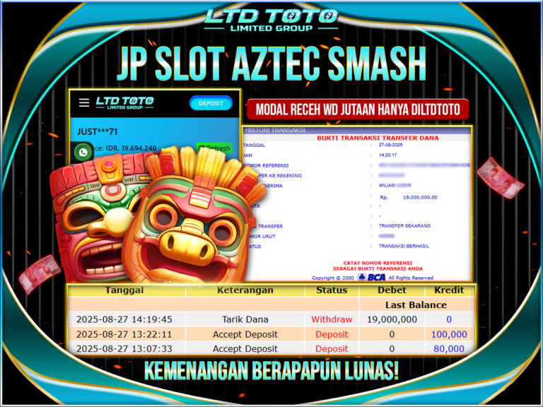 LTDTOTO JACKPOT AZTEC SMASH RP 19.000.000 RABU 27 AUGUST 2025 Selamat kepada User id : JUST***71 Telah berhasil mendapatkan kemenangan besar pada permainan AZTEC SMASH, kemenangan Sebesar Rp.19,000,000, Setelah mengisi formulir withdraw dengan kurang waktu hanya 5 – 10 menit pihak LTDTOTO sudah melakukan transfer kepada pemilik User id dan dana sudah dapat di cairkan oleh pemenang….