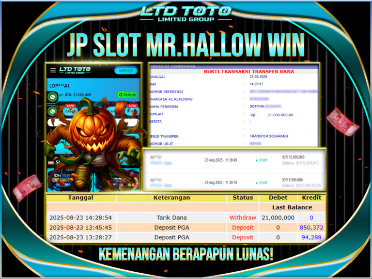 LTDTOTO JACKPOT MR.HALLOW WIN RP 21.000.000 SABTU 23 AUGUST 2025 Selamat kepada User id : LOP***A1 Telah berhasil mendapatkan kemenangan besar pada permainan MR.HALLOW WIN, kemenangan Sebesar Rp.21.000.000, Setelah mengisi formulir withdraw dengan kurang waktu hanya 5 – 10 menit pihak LTDTOTO sudah melakukan transfer kepada pemilik User id dan dana sudah dapat di cairkan oleh pemenang….