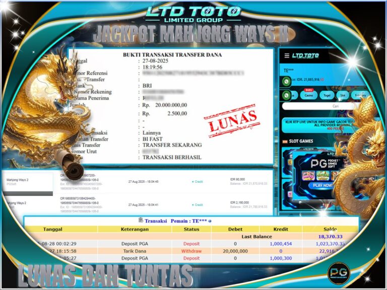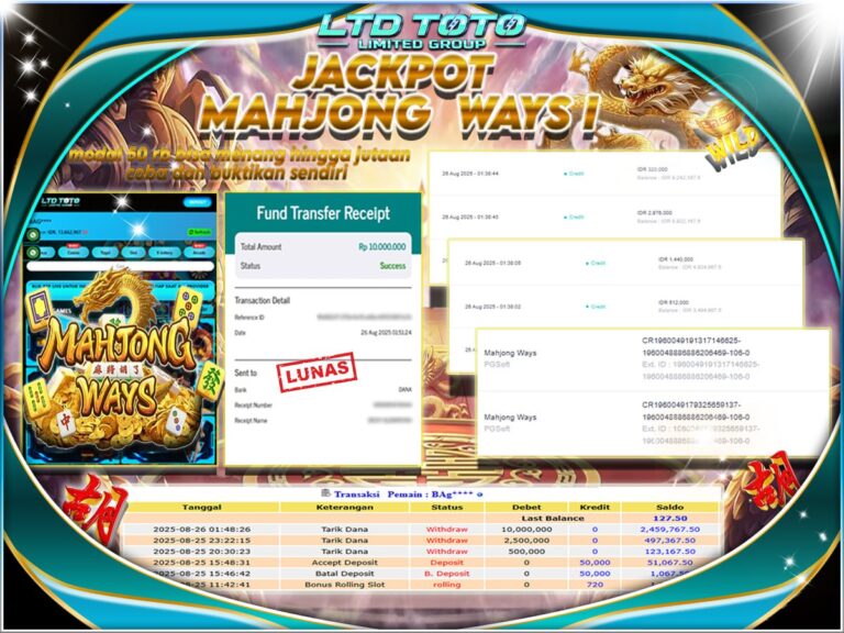 LTDTOTO JACKPOT MAHJONG WAYS 2 RP 20.000.000 KAMIS 28 AUGUST 2025 Selamat kepada User id : TEE*** Telah berhasil mendapatkan kemenangan besar pada permainan PGSOFT MAHJONG WAYS 2, kemenangan Sebesar Rp.20.000.000, Setelah mengisi formulir withdraw dengan kurang waktu hanya 5 – 10 menit pihak LTDTOTO sudah melakukan transfer kepada pemilik User id dan dana sudah dapat di cairkan oleh pemenang. Bukti pembayaran…
